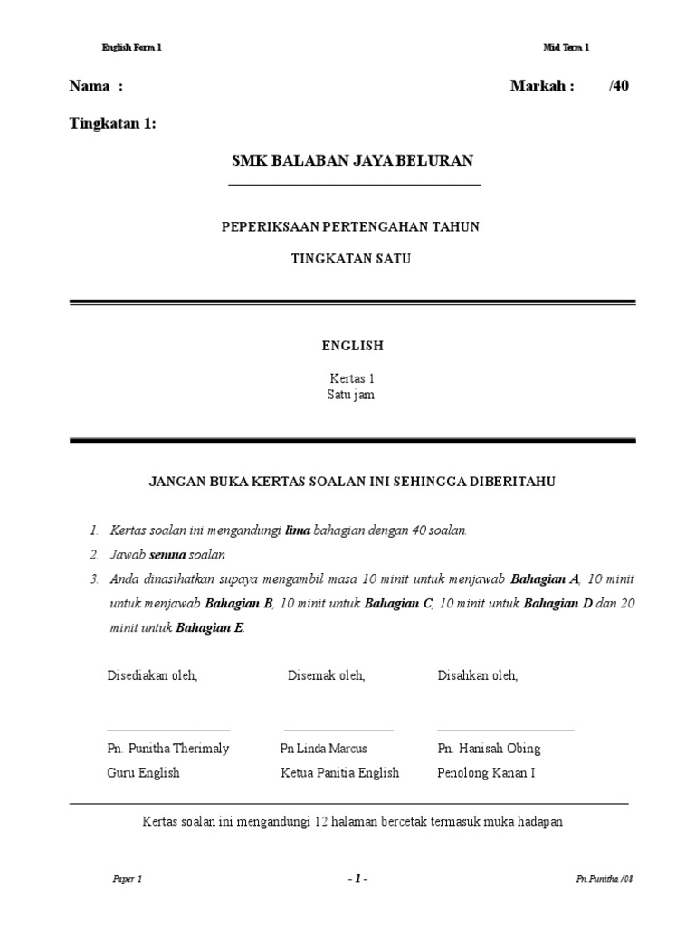 Form 1 English Examination Paper