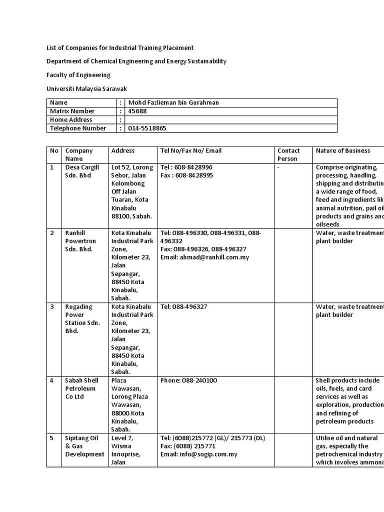 Mohd Fazlieman List Of Companies For Industrial Training Placement